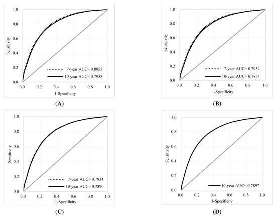 ROC curves and AUCs at different time points for the 7-year and 10-year follow-ups: (A) 2nd year; (B) 4th year (C) 6th year, (D) 8th year for 10-year only.