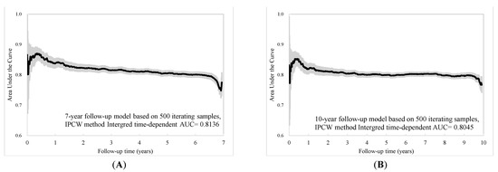 The individual risk score was generated based on the coefficients of the final Cox regression and the low-, intermediate-, and high-risk groups. The risk prediction by using cumulative all-cause mortality was successfully discriminated at 7 years and 10 years (Figure 2A,B), and both p-values of the log-rank test were <0.0001. To evaluate the concordance of the prediction model for the time to death based on the final models that we developed, considering the time-dependent dynamic event, Harrell’s C-statistic was 0.7955 (95% CI: 0.7873, 0.8037) and 0.7775 (95% CI: 0.7708, 0.7842) for the 7-year and 10-year models, respectively (Table 2). The time-varying AUCs at the 2nd, 4th, and 6th years were 0.8053, 0.7954, and 0.7934 for the 7-year follow-up and 0.7958, 0.7854, 0.7890, and 0.7897 (8th year) for the 10-year follow-up, respectively. These AUCs did not show significant differences at different follow-up times (Figure 3A–D). Furthermore, considering the predictive performance of the AUC with 95% CI at continuous times, the IPCW method with 500-iterating samples demonstrated a slightly high AUC within one year, and AUCs were consistent with the follow-up time regardless of the different time points. The same pattern was shown in the 7-year and 10-year models (Figure 4A,B).