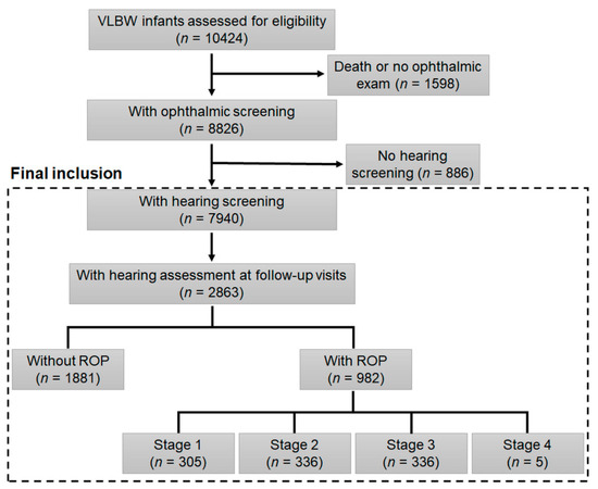 The Korean Neonatal Network (KNN) is a prospective national registry of infants with VLBW, which was established in 2013 by 70 participating hospitals with governmental support from the Korea Centers for Disease Control and Prevention. The registry included clinical data on ROP details and systemic conditions, prenatal/perinatal factors, maternal factors, systemic or ROP management, and hearing assessments. Among the 10,424 infants enrolled between January 2013 and December 2017 in the registry, 1803 were excluded because they had not undergone ophthalmic examination, mainly due to death associated with preterm birth-related complications (n = 1462). Among the 8621 infants with VLBW, those with hearing outcomes evaluated using well-established neonatal screening methods (n = 7940) were included in our analyses. Among them, the hearing outcomes assessed in 2863 infants at 18 months or 3 years of age were analyzed using univariate or multivariate analyses. Figure 1 presents a flowchart of the participant inclusion and exclusion criteria in our study cohort. The present study was performed in accordance with the Declaration of Helsinki and was approved by the KNN data management committee and the Hanyang University Hospital IRB (Protocol No. 2021-02-011).