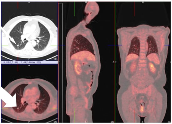 Most patients were male (28 patients, 82.4%) with a mean age of 63 years upon diagnosis (range 41 to 82). Nine patients (26.5%) had a history of obstructive lung diseases such as asthma or chronic obstructive pulmonary disease (COPD), and only three patients (8.8%) suffered from interstitial lung fibrotic disease. Two patients (5.88%) were diagnosed with congestive heart failure. Suspected malignancy was, in all cases, the reason to perform surgery. This oncologic diagnosis was confirmed in 19 patients (55.9% of cases). We could not demonstrate any correlation between the imaging and operative findings. Due to their small size, not all pathologically proven ossifications could be visualized on chest CT scans. A representative image is presented in Figure 2, where a positron emission tomography combined with computed tomography (PET-CT) scan showed a moderate FDG uptake with clear evidence of calcification or ossification in the lesion on the CT alone.