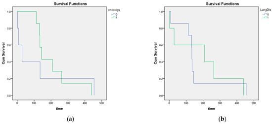 Kaplan–Meier survival analysis of survival time in patients suffering from oncologic disease (a) or pulmonary disease (b). We did not find any significant differences in survival time.