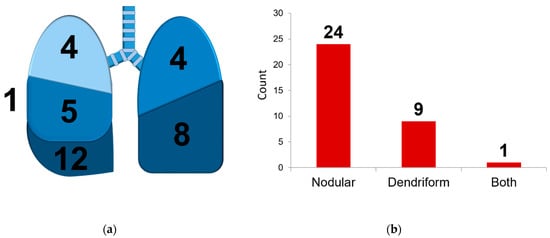 We observed a clear predilection for the lower lobes (left lower lobe in 12 cases, or 35.3%, and right lower lobe in eight cases, or 23.5%), and most ossifications were found in the right lung (21 cases, 61.7%) (Figure 2). We identified 24 cases of nodular ossification (70.6%). In six patients (17.6%), bone marrow formation was observed, equally divided between the nodular and dendriform ossifications.