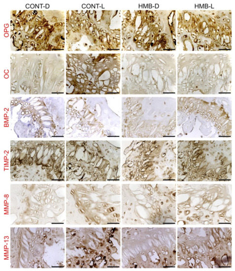 3.2. OPG, OC, BMP-2, TIMP-2, MMP-8 and MMP-13 Immunoreaction in Growth Plate Cartilage