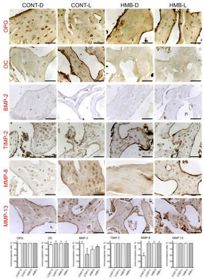 3.3. OPG, OC, BMP-2, TIMP-2, MMP-8 and MMP-13 Immunoreaction in Trabecular Bone
