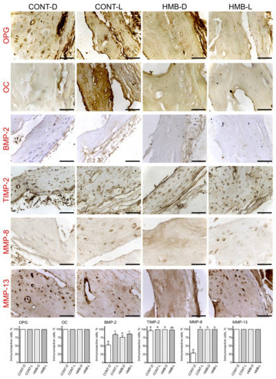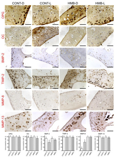 - Tomczyk-Warunek, A.; Blicharski, T.; Jarecki, J.; Dobrowolski, P.; Muszyński, S.; Tomaszewska, E.; Rovati, L.C. The effect of maternal HMB supplementation on bone mechanical and geometrical properties, as well as histomorphometry and immunolocalization of VEGF, TIMP2, MMP13, BMP2 in the bone and cartilage tissue of the humerus of their newborn piglets. PLoS ONE 2021, 16, e0240642. [Google Scholar] [CrossRef]