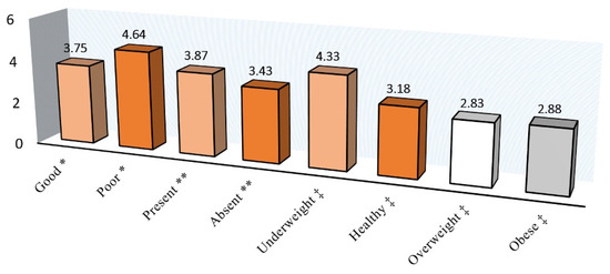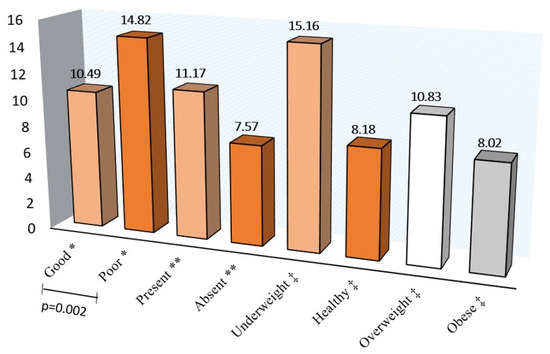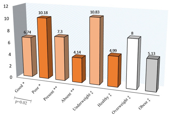 The A-ECOHIS score according to the * Child’s dental health, ** Dental caries status, and ‡ Body mass index.