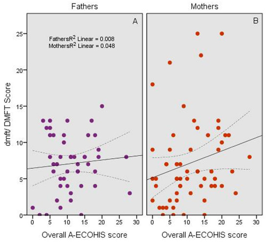 Relationship between the dmft/DMFT scores of the children and the A-ECOHIS score from reports of (A) fathers and (B) mothers. The middle lines show the line of best fit for the correlation and the two lateral lines show the 95% confidence intervals for the mean values.