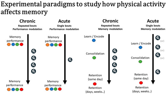 As demonstrated, evidence suggests that both acute and chronic exercise can improve memory function. The appropriate design and use of acute and chronic exercise interventions can provide critical insight as to when and how exercise improves memory for different types of information. Acute paradigms are ideally suited to study time-locked interactions between exercise and the specific phases of memory. This paradigm is also ideal to study transient neuroplasticity changes involved in memory processes. Chronic paradigms, in contrast, are less well-suited to study time-locked interactions but are better equipped to study long-term adaptations (e.g., changes in the hippocampal volume). Notably, both paradigms can be combined. The figure illustrates the use of acute and chronic exercise designs to evaluate their memorial effects across different phases of memory.
