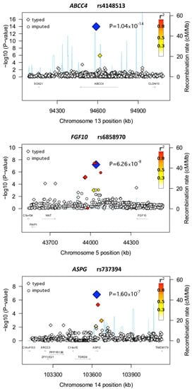 Regional plots of the loci ABCC4, FGF10, and ASPG. Plots of the negative decadic logarithm of the combined p-values obtained in the GWAS are shown. The data were imputed with CEU haplotypes generated by the 1000 Genomes Project (August 2010 release) as a reference. A window of ±500 kb around the lead SNVs (blue solid diamonds) is indicated. The magnitude of the linkage disequilibrium with the central SNV measured by r2 is reflected by the color of each SNV symbol (color coding: see the upper-right corner of the plot). Recombination activity (in centimorgans (cM) per Mb) is depicted by a blue line. Positions are given as NCBI’s build coordinates.