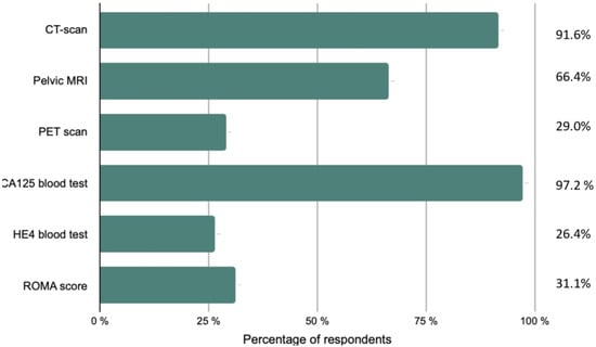 Participants were asked about their assessment upon discovery of EOC (Figure 1). A thoraco-abdomino-pelvic CT scan was recommended by a large majority (91.6%) of respondents, followed by pelvic magnetic resonance imaging (MRI) and a positron emission tomography (PET) scan. A CA125 blood test was an essential paraclinical test for 97.2% of responders, whereas an HE4 blood test was less common (26.2%). A third of the participants performed the Risk of Ovarian Malignancy Algorithm (ROMA).