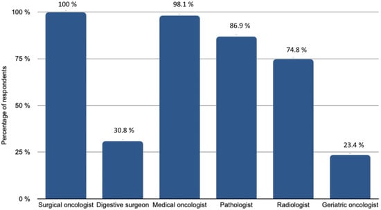 Imaging exams were systematically reviewed by expert radiologists for 78.5% of participants, while preoperative imaging performed outside of the institution was reviewed in only half of the cases. Although 64.5% used Ovarian-Adnexal Reporting and Data System Magnetic Resonance Imaging (O-RADS) in their usual practice, not every centre routinely followed this approach. Of the participants, 103 discussed every patient’s record at tumour board meetings before surgery. The medical specialties included in the tumour board meetings are shown in Figure 2. Finally, patients older than 75 years were systematically referred to a geriatric oncologist in 33.6% of cases and according to their general condition in 65.4% of cases.
