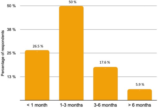 The majority of patients (82.4%) with rare histological subtypes of ovarian tumours were included in the French national observatory for rare malignant tumours of the ovaries (www.ovaire-rare.org, accessed on 2 October 2021) []. The time it took to obtain an oncogenetic consultation varied considerably from one facility to another. Half of the participants provided genetic counselling for their patients within a month. The delays were sometimes longer, ranging from 1 to 3 months for 26.5% of the patients and from 3 to 6 months for 2.9% of patients. The types of BRCA mutations investigated depended on the availability of personal or familial criteria for hereditary cancer. Any delays in obtaining BRCA germline mutation results were respectively reported in Figure 3. A Homologous Recombination Repair Deficiency (HRD) search was performed in 73.5% of cases. The methods used included the Myriad test (87%) and Next Generation Sequencing (NGS) (8.7%) or a combination of both (4.3%).