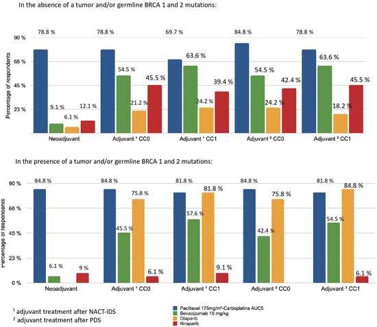 The use of bevacizumab (15 mg/kg) (every 3 weeks) as an adjuvant was lower in cases of non-residual disease (CC0) (54.5%) compared with cases of residual disease (CC1) (78.8%). Bevacizumab (15 mg/kg) was not commonly used as neoadjuvant therapy by responders (<10%). Niraparib was used for adjuvant therapy of women without HRD or BRCA mutation (42.2–45.5%). For tumours and/or germline BRCA 1 and 2 mutations, similar results were observed for bevacizumab and the paclitaxel-carboplatin protocol. Olaparib was prescribed as maintenance therapy for patients with partial (84.8% of respondents) or complete response (75.8% of respondents) to first-line chemotherapy in case of the presence of a tumour and/or germline BRCA 1 and 2 mutations.
