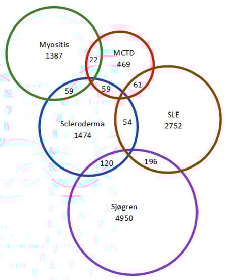 8. Ungprasert, P.; Crowson, C.S.; Chowdhary, V.R.; Ernste, F.C.; Moder, K.G.; Matteson, E.L. Epidemiology of Mixed Connective Tissue Disease, 1985–2014: A Population-Based Study. Arthritis Care Res. 2016, 68, 1843–1848. [Google Scholar] [CrossRef] [PubMed] [Green Version]
