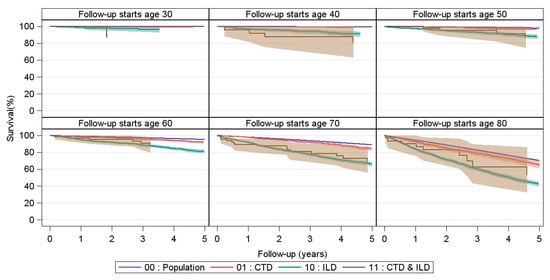 We computed the age and gender distribution for CTD and CTD-ILD overall and for each subgroup of CTD. Survival for CTD patients with and without ILD was assessed using Kaplan–Meier analysis with age as time origin and compared to the general population with and without ILD. All patients who were 40 years of age at any time during the study period were included in the age 40 assessment, etc.
