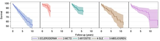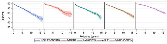 Figure 3. Survival in CTD. Kaplan–Meier survival curves for each CTD subtype with adjustment for age. Time origin is the date of CTD diagnosis. Shaded areas represent 95% confidence intervals.