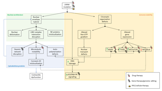 Over 500 mutations, mainly dominant, have been identified throughout the LMNA gene and linked to a broad spectrum of diseases called laminopathies. Different groups of diseases have been described based on the main affected tissue: striated (skeletal and cardiac) muscle laminopathies (SML), peripheral neuropathies, familial partial lipodystrophy and multisystemic disorders including premature aging syndromes [6]. In this review, we describe the pathophysiological mechanisms implicated in laminopathies, i.e., the diseases due to LMNA gene mutations, with a focus on SML and premature ageing syndromes, and associated preclinical therapies that have been developed over the years.