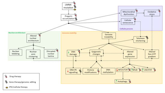 Based on its link with aging, hyperactivation of NF-κB through the JAK/STAT inflammatory signalling pathway was also explored in search of therapeutic molecules. Hence, sodium salicylate, an inhibitor of ATM, NEMO (NF-κB essential modulator) and baricitinib, an inhibitor of JAK1/2, successfully prevented progeroid features [168,169]. Inflammation could also be alleviated via NF-κB activation using an inhibitor of the reprogramming repressor DOT1L (epz-4777) and MG132, which inhibits the secretion of proinflammatory cytokines [170,171].