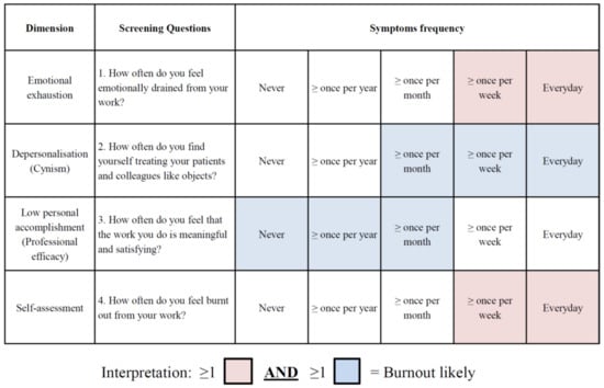 The following are available online at https://www.mdpi.com/article/10.3390/jcm10214836/s1, Table S1: 36-item survey completed by respondents, Table S2: Correlation (Spearman’s rho) between dimensional readouts of burnout in screening tools and the average dimensional scores of the MBI-HSS.