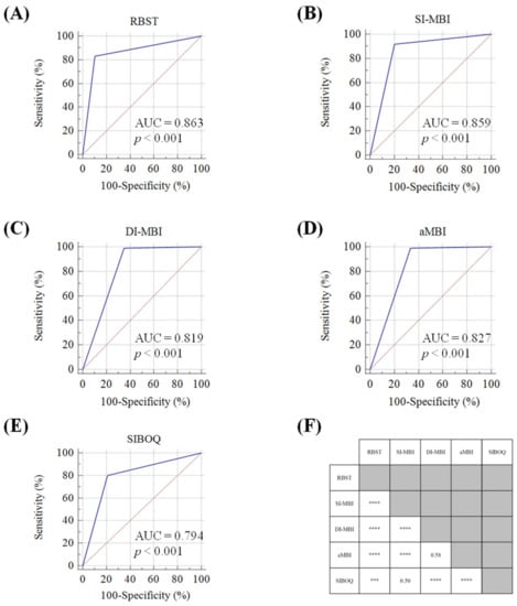 In comparing AUROC scores, the lowest score was 0.80 (SIBOQ), and the highest was 0.86 (RBST and SI-MBI). ROC curves are displayed in Figure 2A–E. Notably, the positive likelihood ratio (+LR), which is not affected by prevalence, distinguished the RBST (+LR = 7.59) from the SI-MBI (+LR = 4.48) and all other screening tools.