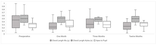 Rocha-de-Lossada, C.; Sánchez-González, J.-M.; Borroni, D.; Llorens-Bellés, V.; Rachwani-Anil, R.; Torras-Sanvicens, J.; Romano, V.; Peraza-Nieves, J. Chord Mu (µ) and Chord Alpha (α) Length Changes in Fuchs Endothelial Corneal Dystrophy before and after Descemet Membrane Endothelial Keratoplasty (DMEK) Surgery. J. Clin. Med. 2021, 10, 4844. https://doi.org/10.3390/jcm10214844