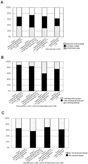 (A) Questionnaire results regarding the driving frequency among individuals who continue driving. (B) Questionnaire results on whether the patients would continue to drive. (C) Questionnaire results on perceiving danger while driving.