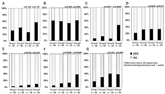 Statistical comparisons were made between the response of each group using chi-square or Fisher’s exact tests, and the tendency was analysed using the Cochran–Armitage tendency tests. For all analyses, a p-value < 0.05 was considered statistically significant.