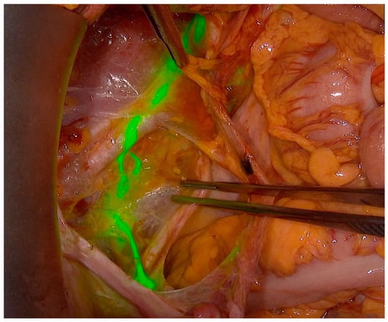 At the time of surgery, after abdominal entry, all patients underwent intraoperative SLN with a standardized cervical injection of 1 cc of ICG 1.25 mg/mL in equally divided aliquots, both superficial (submucosal) and deep (1 cm into the stroma), at 3 and 9 o’clock. About 20–30 min after cervical injection, pelvic retroperitoneal space was opened. Lymph nodes were assessed with a near infra-red (NIR) camera of the PINPOINT system (Stryker, Kalamazoo, Michigan, US) in the case of a laparoscopic approach (Figure 1 and Video S1); SLN in open surgery was detected with the SPY-Portable Handheld Imager (SPY-PHI) (Stryker, Kalamazoo, Michigan, US) as illustrated in Figure 2 and showed in Video S2. Both cameras are designed to provide surgeons with real-time visualization of tissue perfusion and lymphatic vessels and nodes.