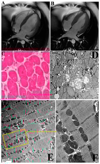 CMR, histologic, and ultrastructural changes of cardiomyocytes in a 45-year-old patient during heart failure caused by myocarditis. Panels (A,B): Cardiac magnetic resonance (CMR) showing bi-ventricular dilatation and severe dysfunction (LVEF 25%). Panels (C–H): LV endomyocardial biopsy showing vacuolar degeneration of myocytes (C) corresponding at electron microscopy to water accumulation in clear cisternae in the endoplasmic reticulum (D) (The bar represents 4 μm), nucleus (E,F), the bar represents 800 nm) and vesiculated mitochondria (G) ×3000 original magnification; (H)—The bar rep-resents 500 nm). In panel (F), remarkable nuclear edema causes chromatolysis and cell death; arrows indicate fragmentation of nuclear membrane. Further details of nuclear changes are better shown in Supplemental Figures S11 and S17.