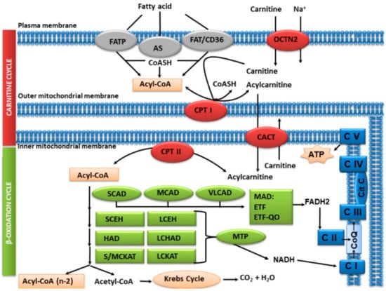 Main stages in carnitine and fatty acid ß-oxidation cycle. Uptake and activation of FA, in gray: FATP, FAT/CD36: fatty acid transporters; AS: acyl-CoA synthetase; Cycling of carnitine to pass the FA to the mitochondrial matrix, in red: OCTN2: carnitine transporter; CPT I: carnitine palmitoyltransferase I; CACT: carnitine-acylcarnitine translocase; CPT II: carnitine palmitoyltransferase II; β-Oxidation spiral, in green: SCAD: short-chain acyl-CoA dehydrogenase; MCAD: medium-chain acyl-CoA dehydrogenase; VLCAD: very long-chain acyl-CoA dehydrogenase; SCEH: short-chain enoyl-CoA hydratase; LCEH: long-chain enoyl-CoA hydratase; HAD (M/SCHAD): 3-hydroxyacyl-CoA dehydrogenase; LCHAD: long-chain 3-hydroxyacyl-CoA dehydrogenase; S/MCKAT: short/medium-chain 3-ketoacyl-CoA thiolase; LCKAT: long-chain 3-ketoacyl-CoA thiolase; MTP: mitochondrial trifunctional protein; MAD: multiple acyl-CoA dehydrogenase; Electron transfer and respiratory chain pathway, in blue: CoQ, CI, CII, CIII, CIV, CV: coenzyme Q and mitochondrial respiratory complexes I, II, III, IV and V.