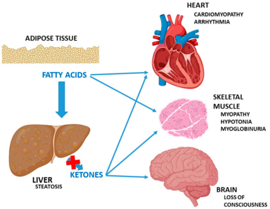 Muscle and cardiac involvement is clear, considering the high requirement of energy that these tissues make of FAO. The accumulation of long-chain acylcarnitines can have a toxic effect in the phospholipids of the sarcolemma, depending on the chain length and the free carboxylic functional groups. These acylcarnitines interact with different ion channels and produce cardiac arrhythmias [15], which have not been observed in short- or medium-chain defects, as they do not require the carnitine system to enter the mitochondria.