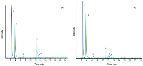 Analysis of short-chain acylcarnitines isomers in serum by HPLC/MS/MS as described by Ferrer et al. (2007) [59]. (a) Short-chain acyl-CoA dehydrogenase deficiency. (b) Isobutyryl-CoA dehydrogenase deficiency. (1) C0, free carnitine; (2) C2, acetylcarnitine; (3) C3, propionylcarnitine; (4) C4, isobutyrylcarnitine; (5) C4, butyrylcarnitine; (6) d3-C4, d3-butyrylcarnitine (internal standard).