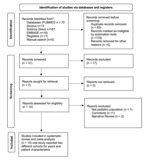 We identified 290 references. Of these, 176 were removed by automation tools (filters applied: English language, 10 years and age <19 years) and 83 as duplicates. The remaining 31 abstracts were examined. Of these, 17 were eliminated. Finally, 14 reports were evaluated for eligibility criteria, four of which were excluded for the following reasons listed in Figure 1.