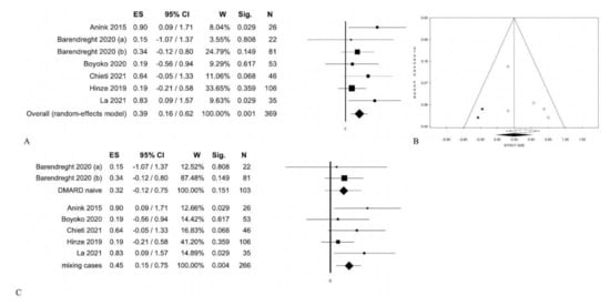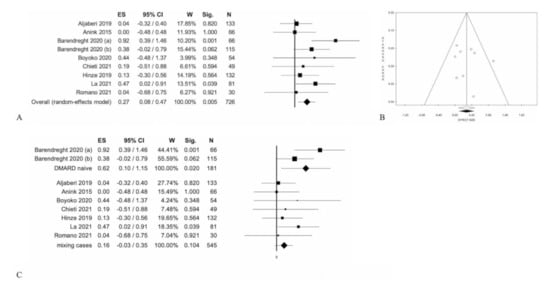 Active disease (pauci and polyarticular forms) vs. inactive disease: (A) Forest Plot of overall cases; (B) Funnel Plot; (C)forest plot according baseline therapy.