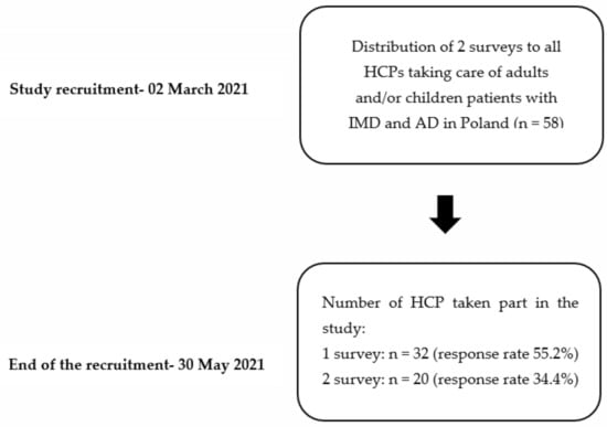 The authors distributed two surveys via email (available as Supplementary Materials) with 30 questions to all 58 health care providers (HCP) taking care of adults or children patients with IMD and AD in Poland. The responders were coordinating physicians responsible for treating the patients (Figure 1).