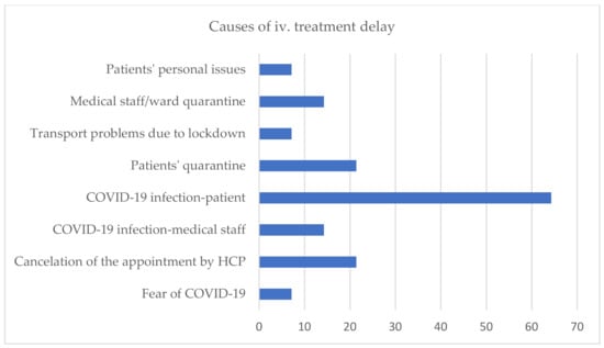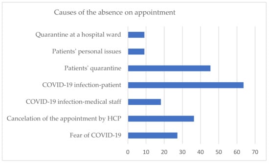 Despite many restrictions and limitations during the COVID-19 pandemic, the majority of HCP (65%) reported that they could continue routine ambulatory visits of patients. Moreover, the continuity of visits was maintained in 7/9 units converted into temporary hospitals dedicated for SARS-COV-2 patients. The causes of postponement or cancellation of appointments in 12/32 cases are shown in Figure 2.