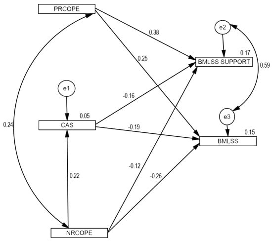 The analysis of the correlations showed significant and positive interrelations between satisfaction with life and satisfaction with social support (r = 0.62. p < 0.001). The association between life satisfaction and COVID-19 anxiety was negative (r = −0.21. p < 0.001). Satisfaction with social support was also significantly and negatively related with COVID-19 anxiety (r = −0.14, p < 0.001). There was a positive correlation between life satisfaction and positive religious coping (r = 0.15, p < 0.001), and a negative correlation between negative religious coping and life satisfaction (r = −0.24, p < 0.001). The relationship between satisfaction with social support and negative coping was insignificant (r = −0.06, p > 0.050) and positive for positive religious coping (r = 0.33, p < 0.001). Relationships between religious coping strategies were also noted—the relationship between positive and negative strategies (r = 0.23, p < 0.001) was found to be positive. COVID-19 anxiety was positively correlated with positive (r = 0.13, p < 0.01) and negative religious coping (r = 0.22. p < 0.001) (see Table 1).