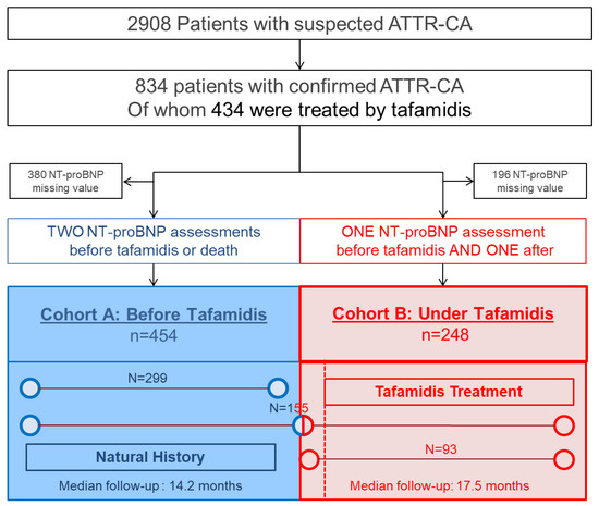 Between 2007 and 2020, 2908 patients with suspected ATTR-CA were referred to our Referral Centre and included in the database (Figure 1). Of these, 834 patients were considered eligible for the study with confirmed ATTR-CA. Of the 834 ATTR-CA patients, 454 patients had two or more NT-proBNP assessments before tafamidis treatment or before an EFS event (Cohort A). In the 834 patients with confirmed ATTR-CA, 434 had received tafamidis (Figure 1). Of these, 248 patients had at least a NT-proBNP assessment before and at least one after initiating tafamidis treatment (Cohort B).