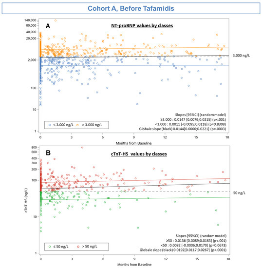 Evolution of biomarkers in Cohort A: Scatter plots of the evolution of log (NT-proBNP) (A) and log (cTnT-HS) (B) levels with time, for patients in Cohort A (n = 454).