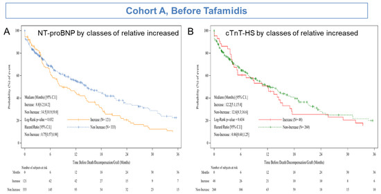For Cohort A, patients were also classified according to whether the initial NT-proBNP level increased with time by 30%, 40%, and 50% relative to the initial level to either increased (30%, 40%, and 50% relative) NT-proBNP or non-increased (30%, 40%, and 50% relative) NT-proBNP groups. Similarly, patients were classified into increased or non-increased cTnT-HS (30%, 40%, and 50% relative) groups.