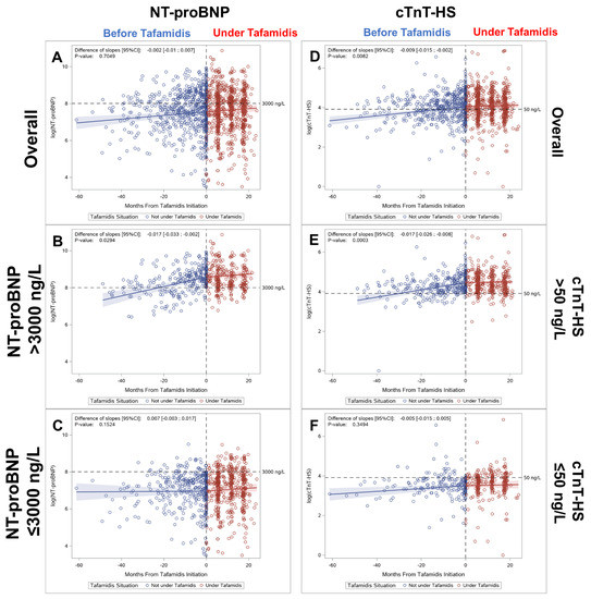 Regression in Cohort B Patients before (blue) and after initiation of tafamidis (red): Of log NT-proBNP (A) and depending on NT-proBNP > 3000 ng/L (n = 92) (B) or NT-proBNP ≤ 3000 ng/L when tafamidis was initiated (n = 156) (C); Regression of log cTnT-HS (D) and depending on cTnT-HS > 50 ng/L when tafamidis was initiated (n = 139) (E); or with cTnT-HS ≤ 50 ng/L (n = 98) (F).