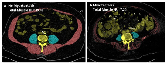 Cross-sectional muscle measurement at the level of the fourth lumbar vertebra (a,b). The blue area identifies the psoas major muscle. The red area represents the abdominal wall and the erector spinae muscles. Total muscle Hounsfield units (HU) were calculated to define myosteatosis.