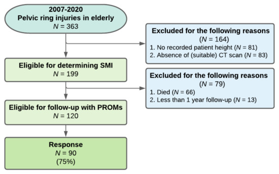Numerous studies have described the harmful health effects of sarcopenia and myosteatosis. Sarcopenia increases the likelihood of falls and injuries [4,5] and could therefore be considered a potential complementary predictive value for fracture risk [6]. Sarcopenia is also associated with increased rates of osteoporosis, morbidity and mortality [6,7,8]. Pelvic ring injuries are likewise known for their high mortality rates, which are estimated at 15% [9]. In the elderly, mortality can even rise up to 27% at 1 year [10]. It has been shown that patients suffering from pelvic ring injuries deal with decreased patient-reported physical functioning and quality of life (QoL) [10,11]. Sarcopenia and myosteatosis are seen as important determinants of physical functioning and QoL. The loss of skeletal muscle mass directly contributes to exercise intolerance, impaired ability to perform activities of daily living and loss of independence [3,5,12]. Still, the use of sarcopenia and myosteatosis as measures for frailty in musculoskeletal-related literature is sparse and little is known about the prevalence, mortality and effect on patient-perceived physical functioning and QoL in patients with pelvic ring injuries.