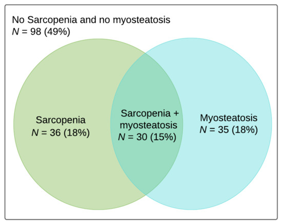 Venn diagram showing patients with sarcopenia, myosteatosis, both or neither.