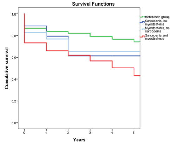 Kaplan–Meier survival curve of patients with or without sarcopenia and/or myosteatosis within the first five years post-injury. The green line represents the reference group (patients without sarcopenia or myosteatosis).