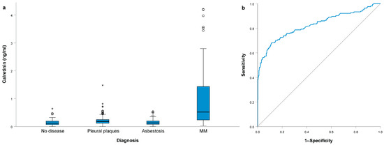 (a) Serum calretinin concentration in different subject groups; (b) ROC curve analysis for serum calretinin concentration comparing malignant mesothelioma (MM) patients with all other subjects. All boxplots represent median with interquartile range, while outliers are represented using circles and extreme outliers are represented using * symbol.