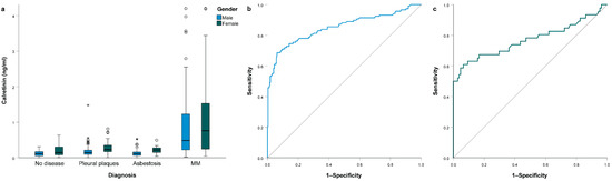 (a) Serum calretinin concentration in different subject groups stratified by gender; (b) ROC curve analysis for serum calretinin concentration comparing malignant mesothelioma (MM) patients with all other subjects among men; (c) ROC curve analysis for serum calretinin concentration comparing MM patients with all other subjects among women. All boxplots represent median with interquartile range, while outliers are represented using circles and extreme outliers are represented using * symbol.