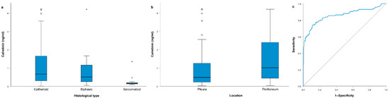 (a) Association of histological type with serum calretinin levels; (b) association of malignant mesothelioma (MM) location with serum calretinin levels; (c) ROC curve analysis for serum calretinin concentration comparing patients with epithelioid MM with all other subjects. All boxplots represent median with interquartile range, while outliers are represented using circles and extreme outliers are represented using * symbol.