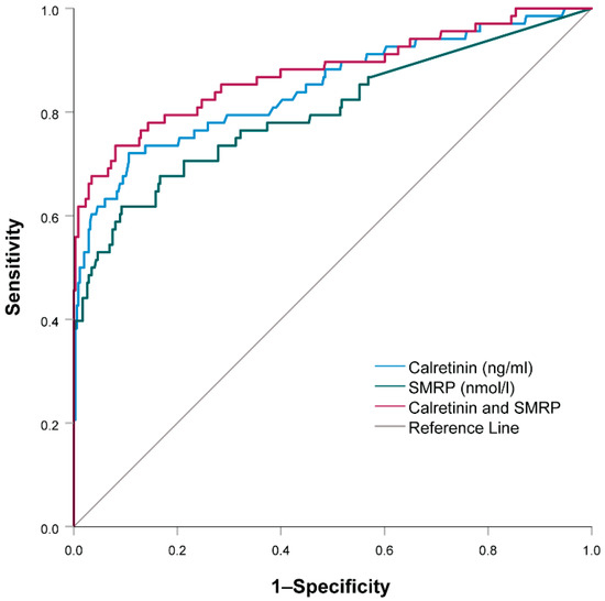 Using the ROC curve analysis, we also assessed how well calretinin or SMRP or both together could predict MM (Figure 4). The AUC for calretinin alone was 0.847 (95% CI = 0.787–0.907; p < 0.001). At the cutoff value of 0.32 ng/mL, sensitivity for predicting MM was 0.721, while specificity was 0.894. The AUC for SMRP alone was 0.800 (95% CI = 0.731–0.868). At the cutoff value of 1.55 nmol/L, sensitivity for predicting MM was 0.735, while specificity was 0.920. The AUC for the combination of calretinin and mesothelin was 0.877 (95% CI = 0.821–0.932; p < 0.001). At the cutoff value score of −1.69, sensitivity for predicting MM was 0.735, while specificity was 0.920. For specificities of 0.950, 0.970 and 0.990, sensitivities were 0.676, 0.662 and 0.618, respectively, while cutoff values were −1.32, −0.87 and −0.06, respectively.