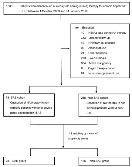 The patient selection process is shown in Figure 1. We screened 1838 non-cirrhotic patients who had discontinued NA therapy due to achieving the therapeutic endpoints of CHB (undetectable HBV DNA and negative HBeAg). The therapeutic endpoints of CHB were based on the clinical practice regulations of the Taiwan’s National Health Insurance, which were modified according to the Asian-Pacific clinical practice guidelines (HBeAg loss with NA consolidation therapy for 6–12 months amongst HBeAg-positive patients; undetectable HBV DNA with NA consolidation therapy for 12 months amongst HBeAg-negative patients) [5]. The exclusion criteria were as follows: (1) HBsAg seroclearance during NA therapy; (2) loss to follow-up in our hospital after discontinuing NA therapy; (3) a diagnosis of hepatitis C virus (HCV) or human immunodeficiency virus (HIV) co-infection; (4) alcohol abuse; (5) hepatitis other than CHB; (6) liver cirrhosis, which was diagnosed by image studies and supplementary clinical/laboratory features during NA therapy; (7) active malignancy; (8) organ transplantation; and (9) immunosuppressant use. After excluding the above-mentioned confounding conditions, we further divided patients into the SAE and non-SAE cohorts according to their initial indications for starting NA therapy. SAE of CHB was defined as hepatitis B flare (HBV viral load > 2000 IU/mL and ALT > 5X ULN) with jaundice (total bilirubin ≥ 2 mg/dL), and/or coagulopathy (prothrombin time (PT) prolongation ≥ 3 s) [18]. The ULN of ALT was defined according to the updated American Association for the Study of Liver Diseases criteria (>25 U/L for females and >35 U/L for males). After excluding patients with confounding conditions patients in the SAE group were randomly matched 1:2 with patients in the non-SAE group by means of propensity scores, which consisted of age, gender, NA categories, NA therapy duration, and HBeAg status prior to NA therapy. LAM and LdT were categorized as the same group due to their similar characteristics [4,5].